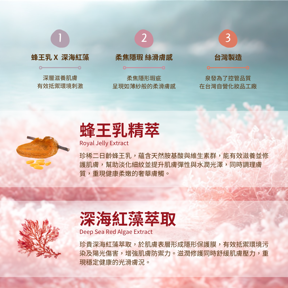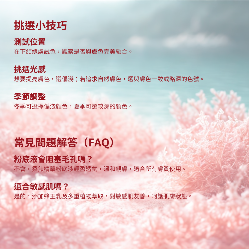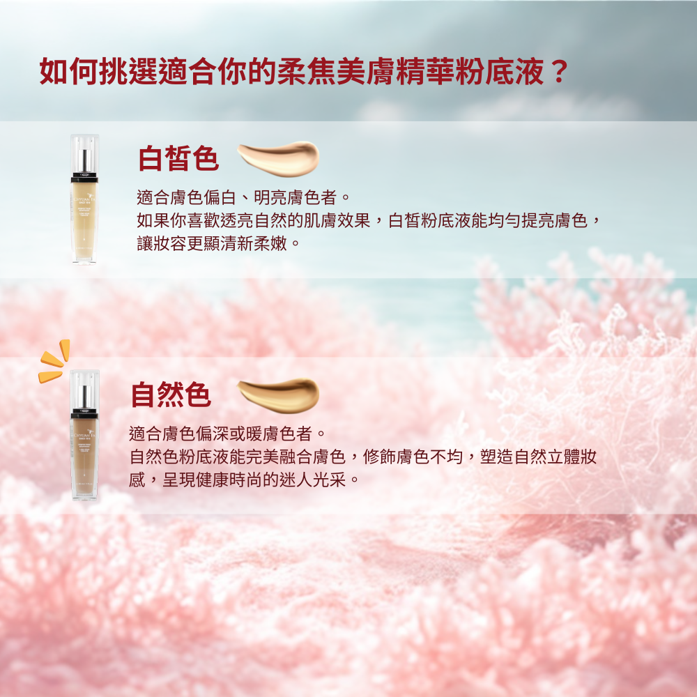 柔焦美膚粉底精華亦適合乾燥膚質,運用深海紅藻萃取,在肌膚形成保護薄膜免於嚴峻環境因子影響,有效抵禦強烈陽光與外來空汙及刺激物質,加強肌膚抵抗力。精華粉底的細膩的延展力,可令黯沉、瑕疵完美隱形,猶如臉部的細緻薄紗,典雅柔焦,楚楚動人。